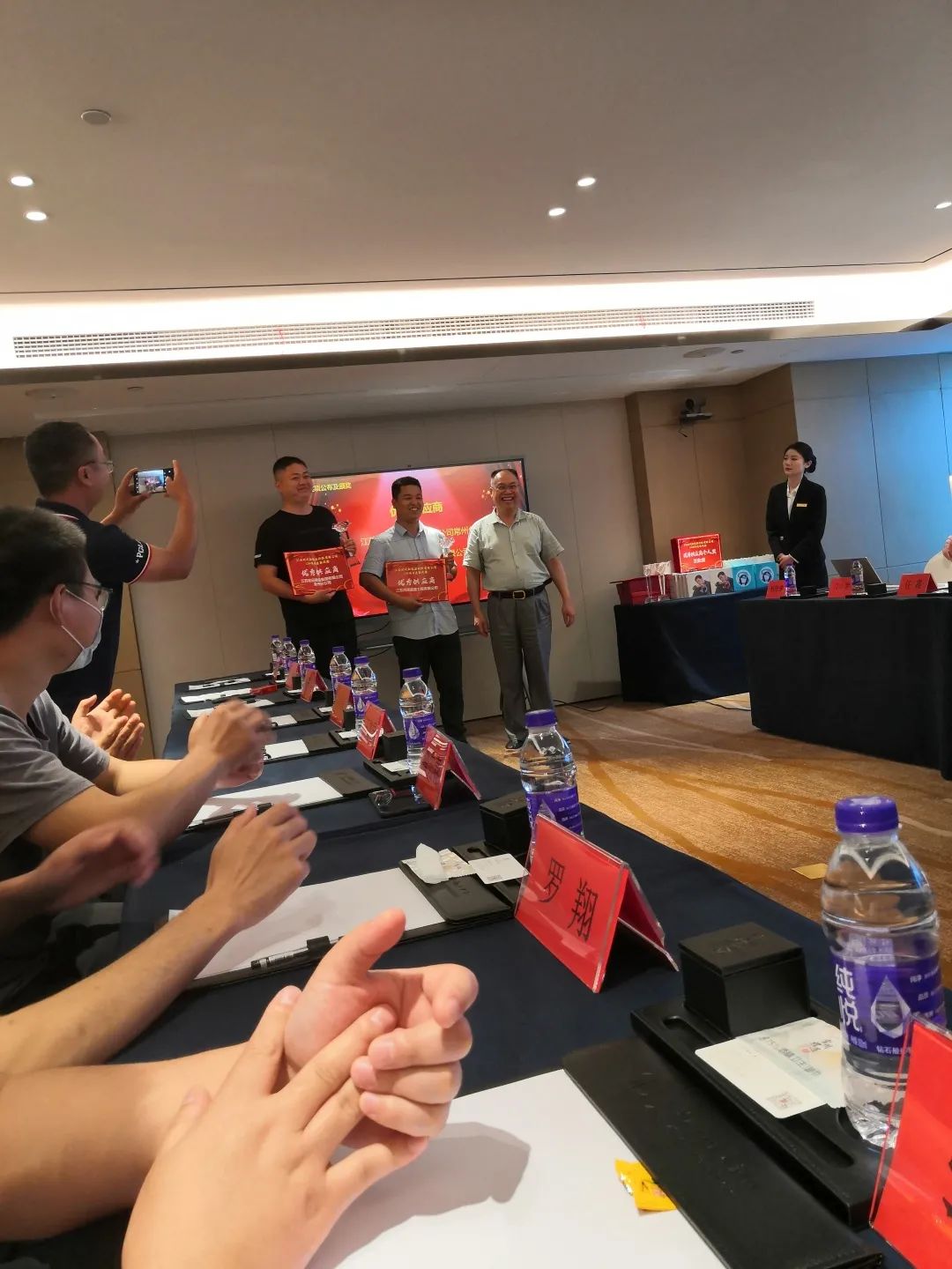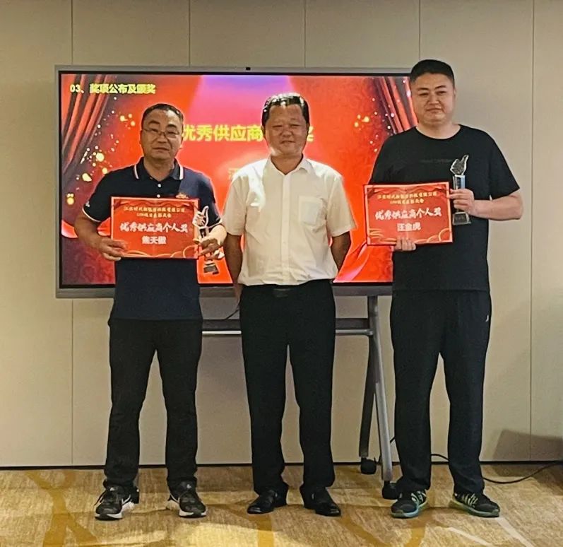 江蘇時(shí)代大區經(jīng)理尹治國為我司頒發(fā)了“優(yōu)秀供應商”獎?wù)屡c獎杯,我司事業(yè)一部經(jīng)理王恒參加大會(huì )并代表公司上臺領(lǐng)獎。